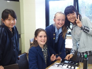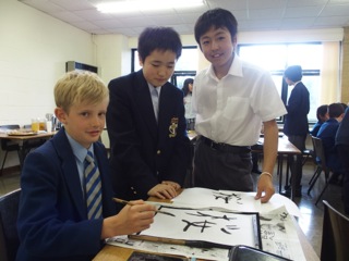 第1回はPennthorpeの生徒達が立教にやってきました。まずば、初対面同士少し緊張しながら、立教生は英語で、Pennthorpeの生徒達は日本語で、参加者全員と一人ひとり挨拶しました。それが済むと、立教生とイギリス人の生徒がペアになって座りました。立教生はみんな、覚えたての英語とジェスチャーでなんとかコミュニケーションを取りながら、イギリス人の子達に書道を教えました。まずは立教生がお手本に、日本らしい単語(さくら等)の書き方を教えてあげたり、イギリス人の子達の名前を片仮名で書いてあげたりしました。その後、Pennthorpeの生徒達も、見よう見まねで筆を持ち、書道に挑戦しました。みんななかなか上手に書けていました。イギリス人の生徒達はとても喜んでくれて、中には妹やお父さんの名前まで練習したペアも何組かいました。楽しい1時間はあっという間に過ぎて、Pennthorpeの生徒達は再会を約束して帰っていきました。