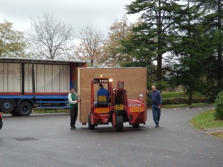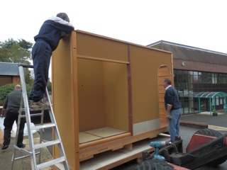 といっても、運ばれた茶室は水屋部分が組み立てられているだけで、あとはすべて解体された部分部分の状態。これから組み立てを行わなければなりません。茶室に座れるようになるのは2012年のことになるでしょう。英国人スタッフも、茶道部員もその日を心待ちにわくわくしています。運び入れるだけで、みな大興奮でした!