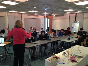 その後はテーブルマナーの授業です。明日のフォーマルディナーに向けて、実際の食器を用いての講義です。立教より多い食器の数と種類、ルールについてみんな驚きを隠せません。しかし、立教でもテーブルマナーを教わっているので、基本的なことはしっかりと身についている様子。先生の質問にも積極的に答えていました。彼らが特に驚いたのはティースプーンとコーヒースプーンが異なることです。「立教には小さなスプーンは1つしかないよ!」「なんで違うの?」「洗うの大変そう…」と疑問や感想がたくさん飛び交っていました。