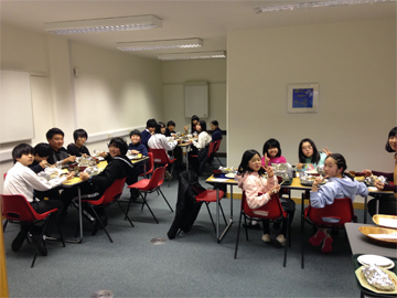 夜はお待ちかね、Quiz Nightです。嘉悦センターに隣接したカレッジのチーム名に分かれての対抗戦です。クイズのテーマはクリスマス。午前中に学習した内容の問題も出題され、子供たちも自分の記憶を辿りながら、ああでもないこうでもないと話し合います。答え合わせの最中には、エクストラの問題も出され、優勝しようと次々に手が上がります。見事勝利したカレッジにはピーターさんからクリスマスプレゼントが贈られました。