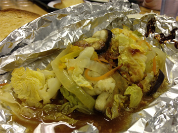 夕ご飯はシェフの和子さんのご出身、北海道の郷土料理「ちゃんちゃん焼き」です。アルミホイルを開けるとたっぷりのお野菜に包まれた鮭と香ばしいお味噌の香りがして思わず顔がほころびます。お腹いっぱい食べて、1日の疲れが癒されたことでしょう。