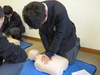 生徒は6~7体のマネキンを前に心臓マッサージを30回、人工呼吸を2回、繰り返し何セットも行いました。初めは楽しそうに行っていましたが、想像以上に大変な作業に「少し休憩。」と言って座り込んでしまう生徒もいました。人の命を救うということがどれほど大変なことなのかをこの実習を通して体験できた瞬間でした。