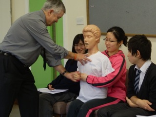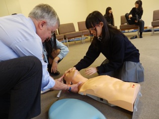 1グループ14名を2グループ作り、それぞれ2時間みっちり英国人のエリックさんからFIRST AIDの基本を学びます。エリックさんは、元々警察官で自分の知人に起こった悲しい事故をきっかけに、St John Ambulanceや警察署でFIRST AIDのトレーニングを始めました。現在は様々な学校で積極的にFIRST AIDを教えているそうです。