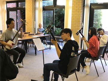 講師は、ケンブリッジ大学研修の時にも私たちを教えてくださっている一川響さんです。最初は緊張していた生徒たちでしたが、一川さんが和やかな雰囲気を作ってくれて、三味線の持ち方から弾き方まで、ひとつひとつわかりやすく教えてくださいました。そして、みんなで『さくらさくら』を演奏することに!