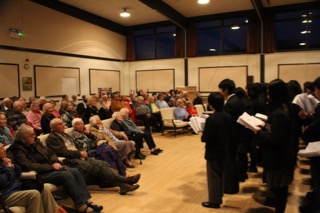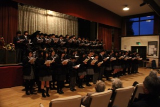 12月2日、終業礼拝の前日、毎年恒例のキャロリングが行われた。この行事は、学校の近くにある高齢者向け居住施設、Elmbridge Villedgeに住む方々に、クリスマスソングや聖歌の歌声をプレゼントするものである。全校生徒がバスで移動し、舞台の上から観客の方々に十数曲にわたる曲目を披露する。年に一度のこのイベントをとても楽しみにして下さっているElmbridge Villedgeの方々も沢山いるということで、いい歌声を聴かせたいと今年も聖歌指導を中心に歌の練習を頑張ってきた。